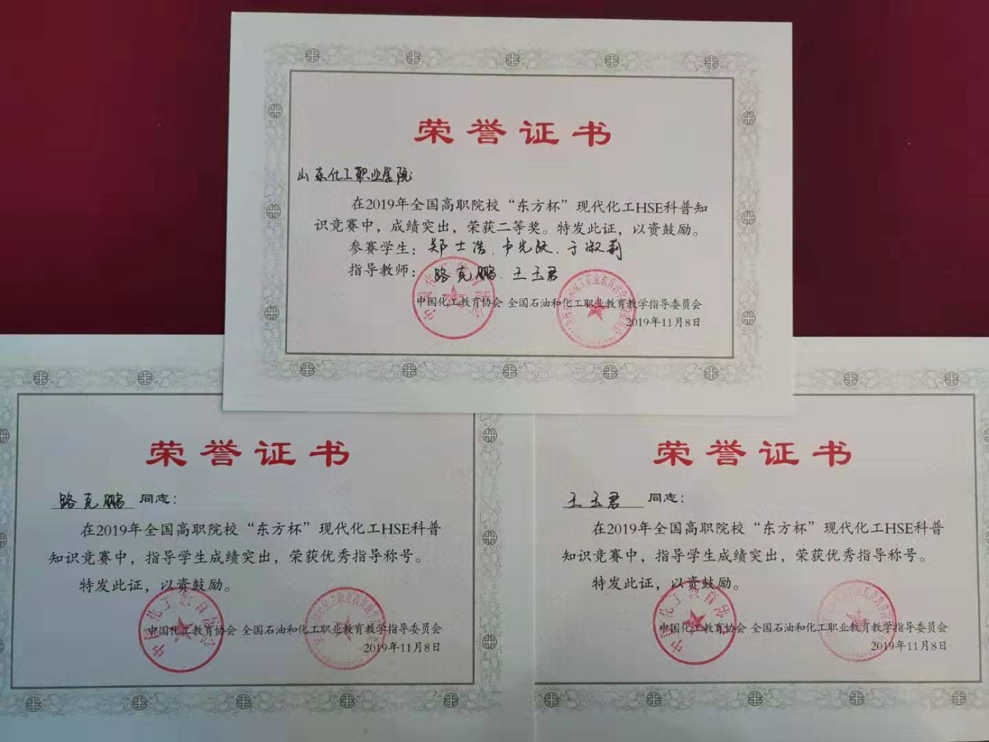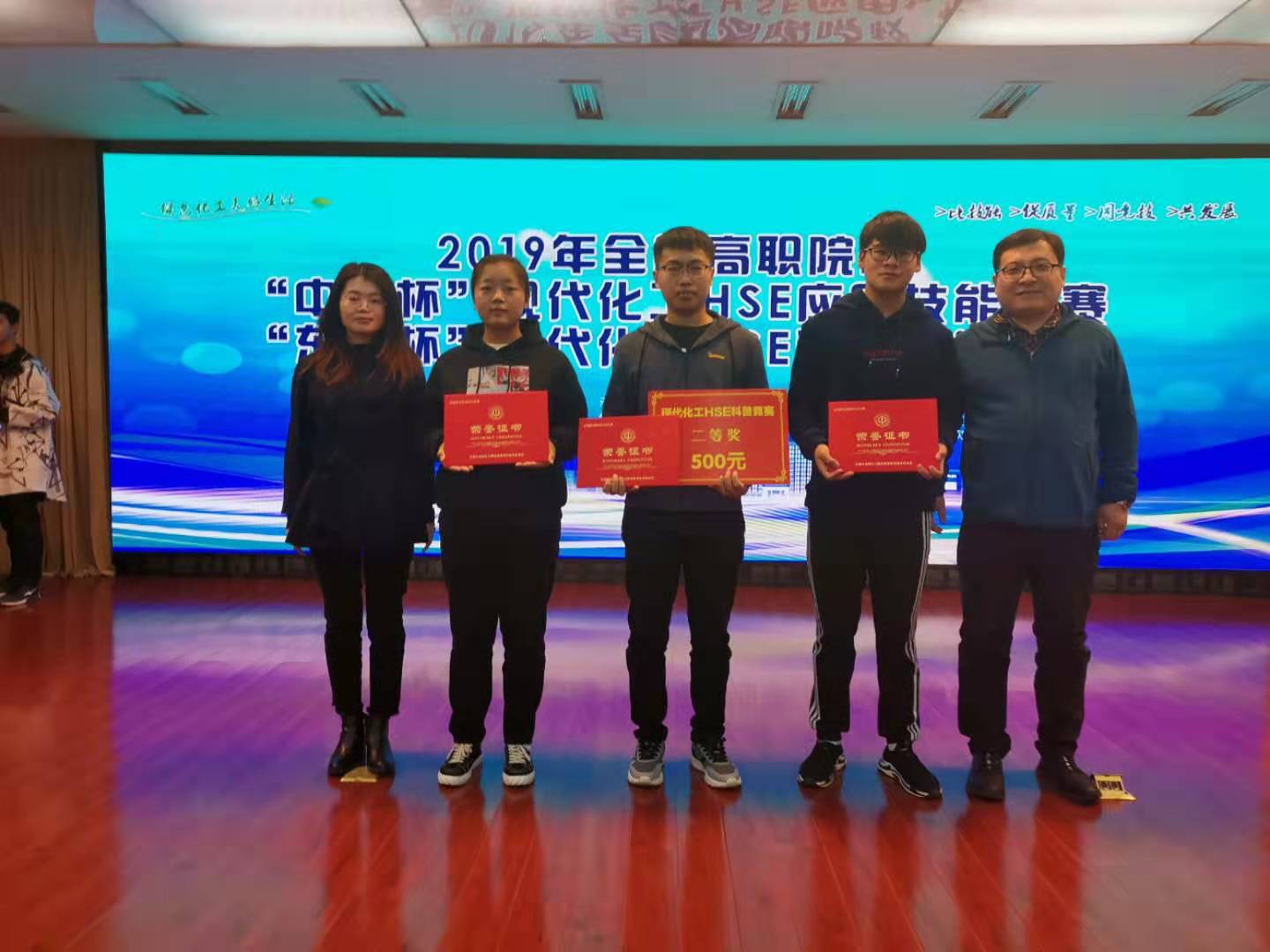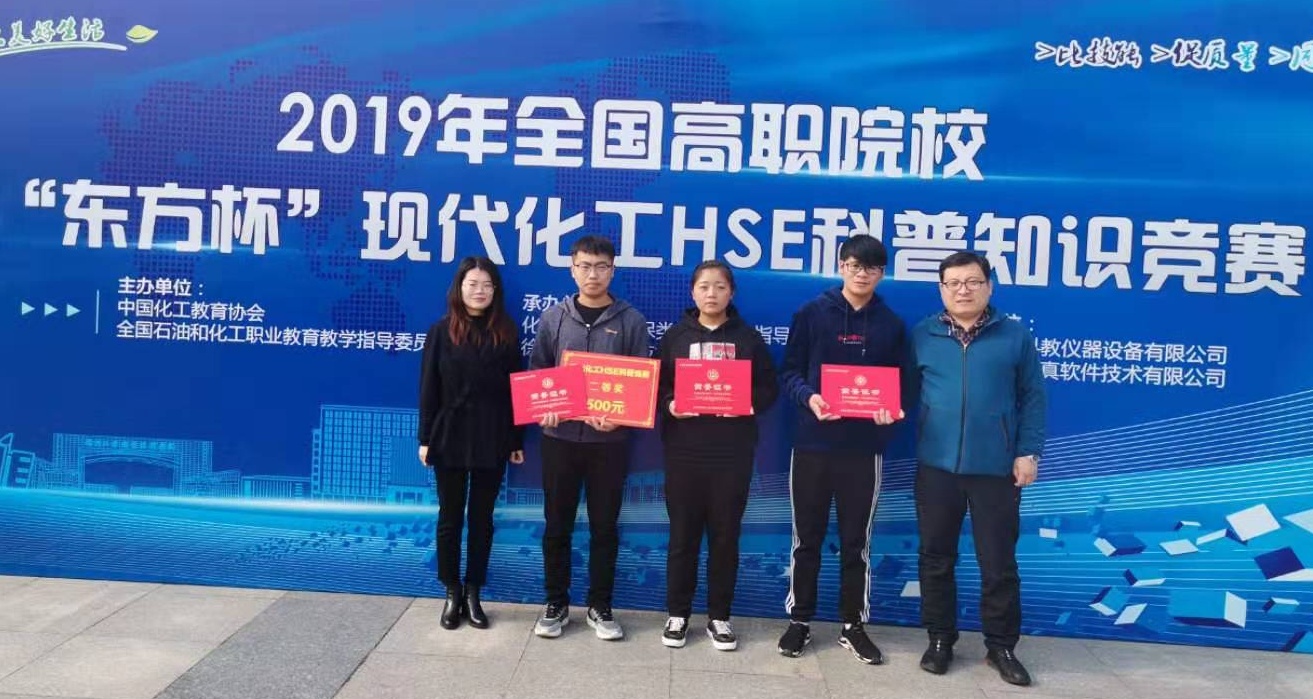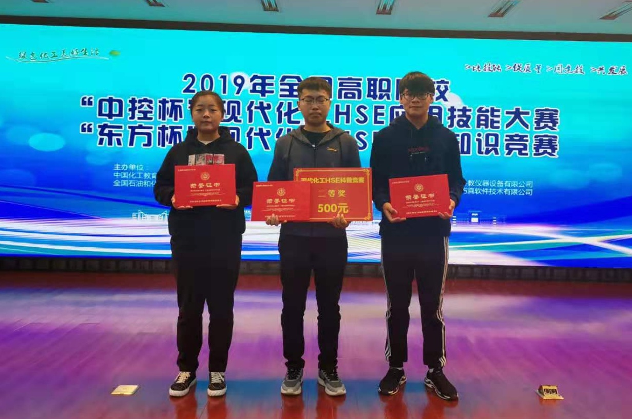 11月7日,由中国化工教育协会主办,高职化工安全及环保类专业教学指导委员会、徐州工业职业技术学院承办的2019年全国高职院校现代化工HSE科普知识竞赛在徐州工业职业技术学院举行。山东化工职业学院化学工程系学生郑士浩、卢光跃、于淑莉组成的代表队,在比赛开局不利的情况下,奋起直追,获得小组第二名,并最终荣获科普知识竞赛团体二等奖,路克鹏、王玉君老师荣获优秀指导教师称号。