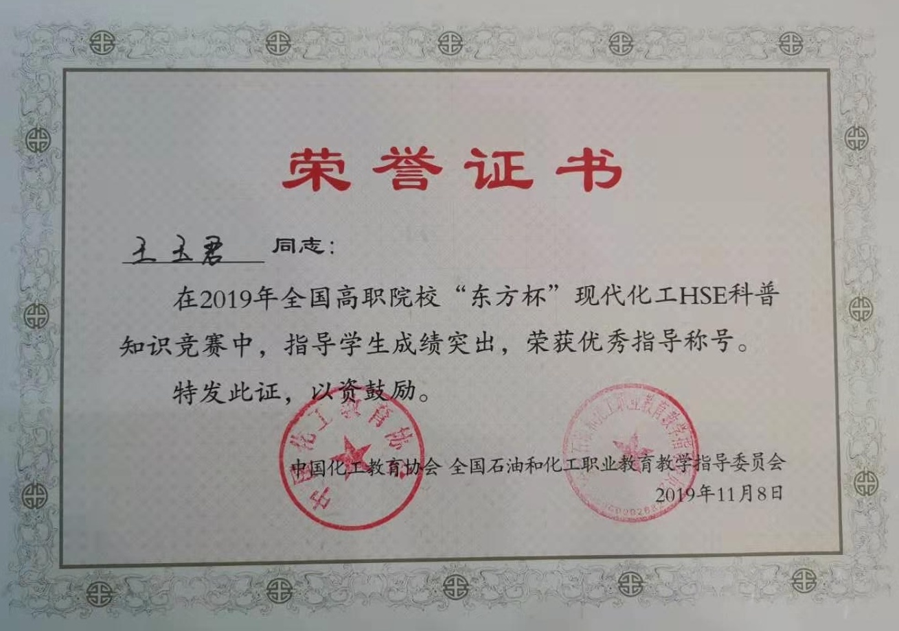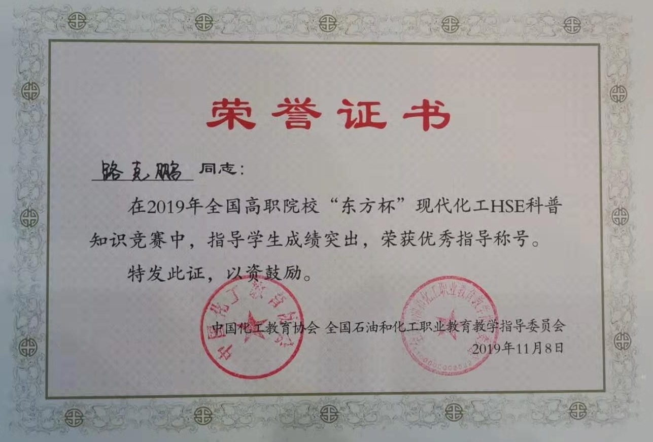 化学工程系为在全体教师和学生中推行现代化工健康、安全、环保理念,学习普及HSE知识技能,积极组队参加2019年全国高职院校现代化工HSE科普知识竞赛。在接到比赛通知后,化学工程系先后组织200余名学生进行了多次上机比赛,初选选拔出70名学生,然后进行闭卷考试,最终精心选拔出3名学生代表学院参赛。为了备战比赛,从赛前一个月开始,每天学生和指导教师都要忙碌到晚上九点多,周末也不休息,最终在学生和老师的共同努力下,荣获全国高职院校现代化工HSE科普知识竞赛二等奖及优秀指导教师称号。
