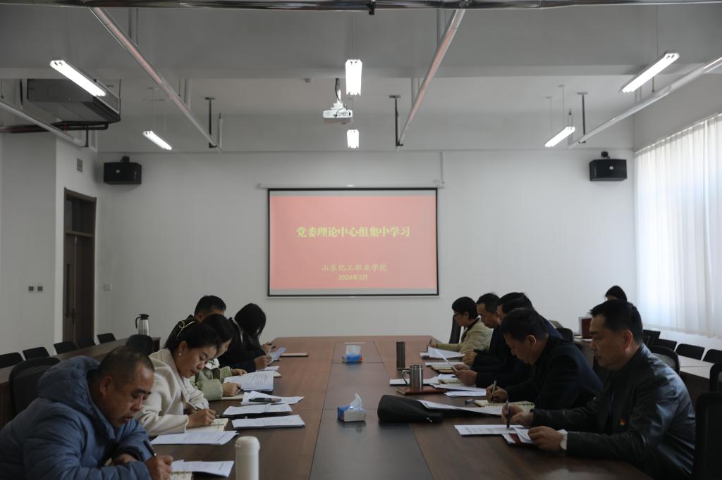 3月26日下午,山东化工职业学院召开3月党委理论中心组学习活动。会议由党委书记孔祥奴同志主持,党委委员冯喜成同志带领学习《政府工作报告--2024年3月5日在第十四届全国人民代表大会第二次会议上》,李凤娟同志带领《关于认真贯彻落实习近平总书记重要批示精神推动党政机关习惯过紧日子的通知》。中心组成员和党委部门主要负责人列席。