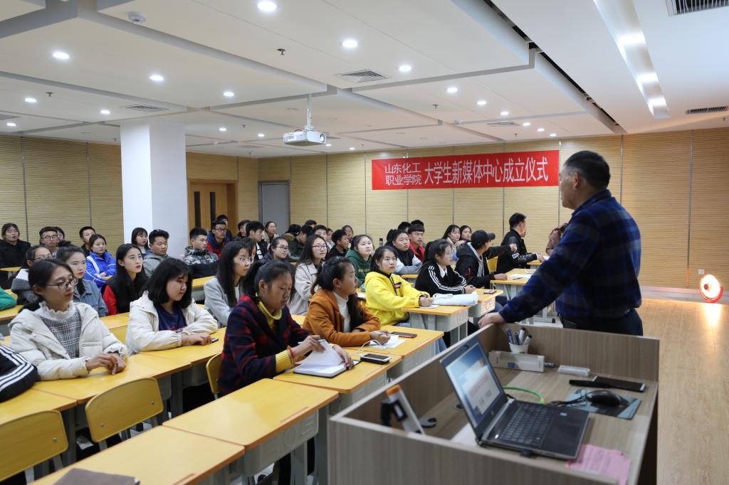 大学生新媒体中心总负责人、学院党委宣传部部长尹起浩在成立仪式上讲话。他说,很高兴能够与大家相聚在这里,亲自见证成立“大学生新媒体中心”这个重要而神圣的时刻,我为此感到激动。新媒体中心是学院顺应新时代互联网宣传思想工作的需要而成立的学生社团组织。紧紧依托“山东化工职业学院”、“山东化院青春在线”这两个官方微信平台,以“服务全体师生、展现学院形象”为宗旨,以独特的视角传递校园信息,努力打造贴心、实用的学院官方微信宣传阵地。