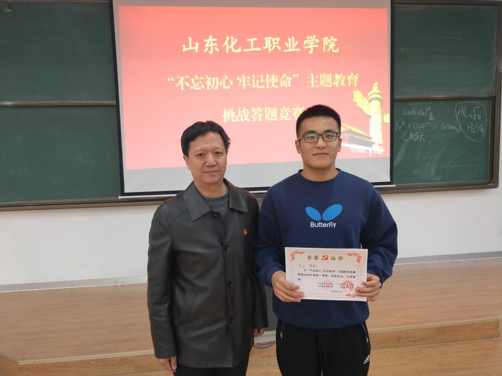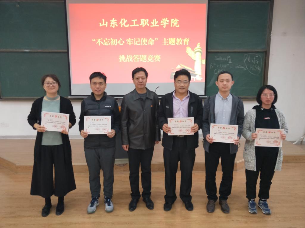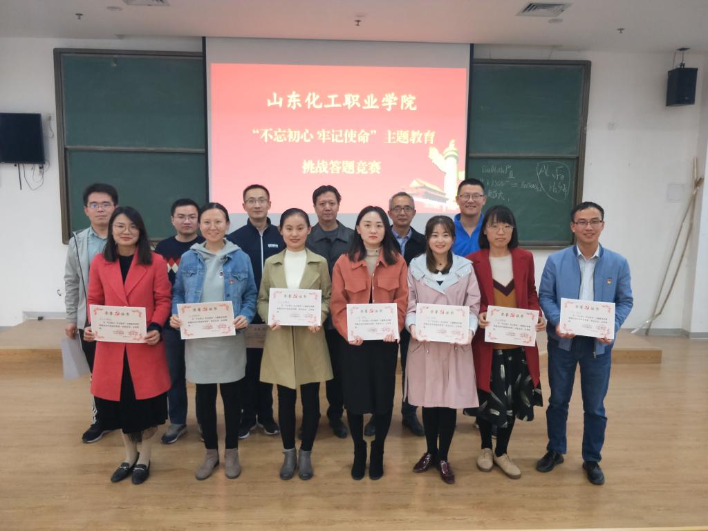 为深入学习贯彻习近平新时代中国特色社会主义思想和党的十九大精神,扎实开展“不忘初心、牢记使命”主题教育,10月31日,山东化工职业学院举行了“不忘初心、牢记使命”主题教育竞赛答题活动,来自全校7个党支部的21名教职工手持手机,在学习强国平台上指尖飞舞,在规定的20分钟时间内,快速抢答题目,最终,基础教学部的李辰老师以最高分脱颖而出获得第一名,基础教学部党支部获得团体第一名。